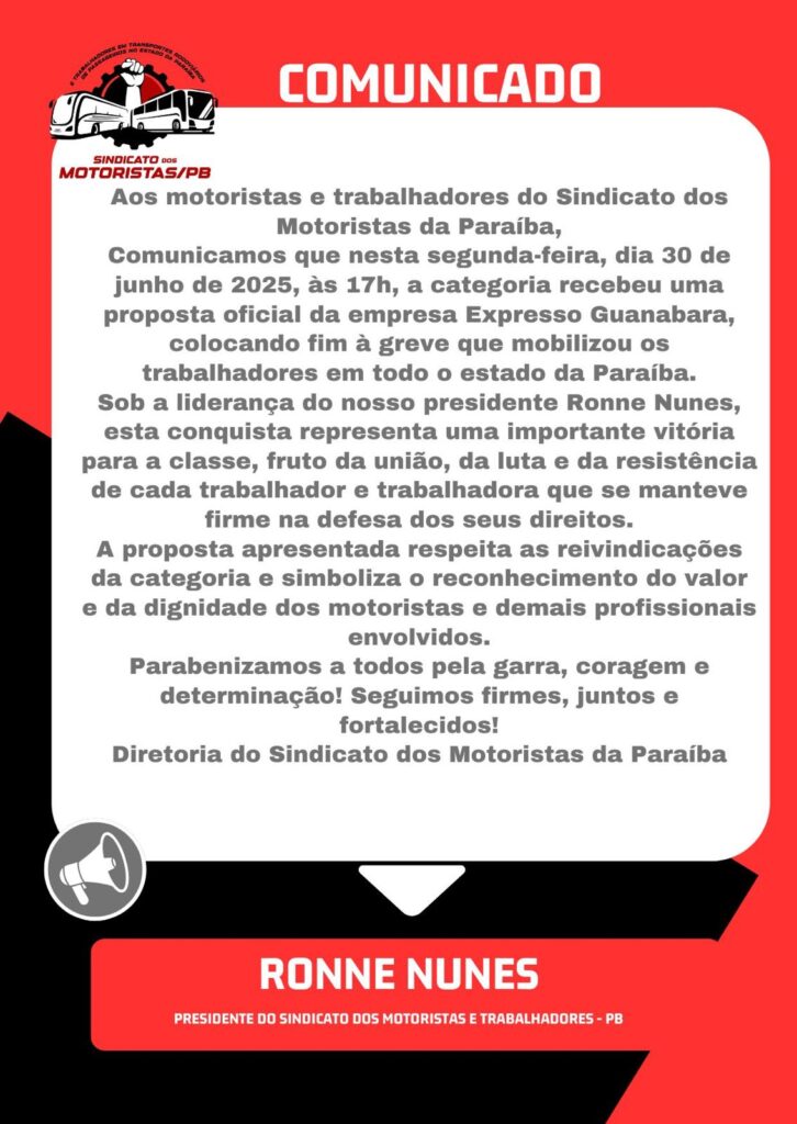 Em comunicado divulgado no final da tarde desta segunda-feira (30), os trabalhadores da empresa de ônibus Guanabara anunciaram o fim da greve na Paraíba, após o grupo concordar com a proposta apresentada.