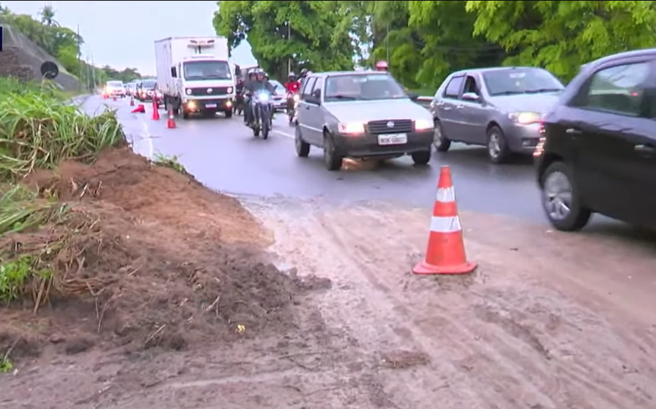 Fortes chuvas causaram um deslizamento de terra na madrugada de hoje (2) interditando parcialmente a BR-230, no sentido João Pessoa–Cabedelo, no trecho do bairro Castelo Branco. O incidente ocorreu após fortes chuvas e deixou apenas uma das duas faixas liberada, provocando lentidão no tráfego.