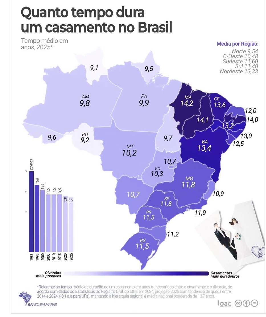 Entre os estados, Roraima lidera com 9,1 anos, acompanhado por Rondônia (9,2), Amapá (9,5), Acre (9,6), Tocantins (9,7), Amazonas (9,8) e Pará (9,9). No extremo oposto, os casamentos mais longos estão concentrados no Nordeste: Maranhão (14,2), Piauí (14,1) e Paraíba (14,0) são os que mais tempo permanecem unidos. Bahia (13,4), Ceará (13,6) e Pernambuco (13,2) também figuram entre os de maior duração.