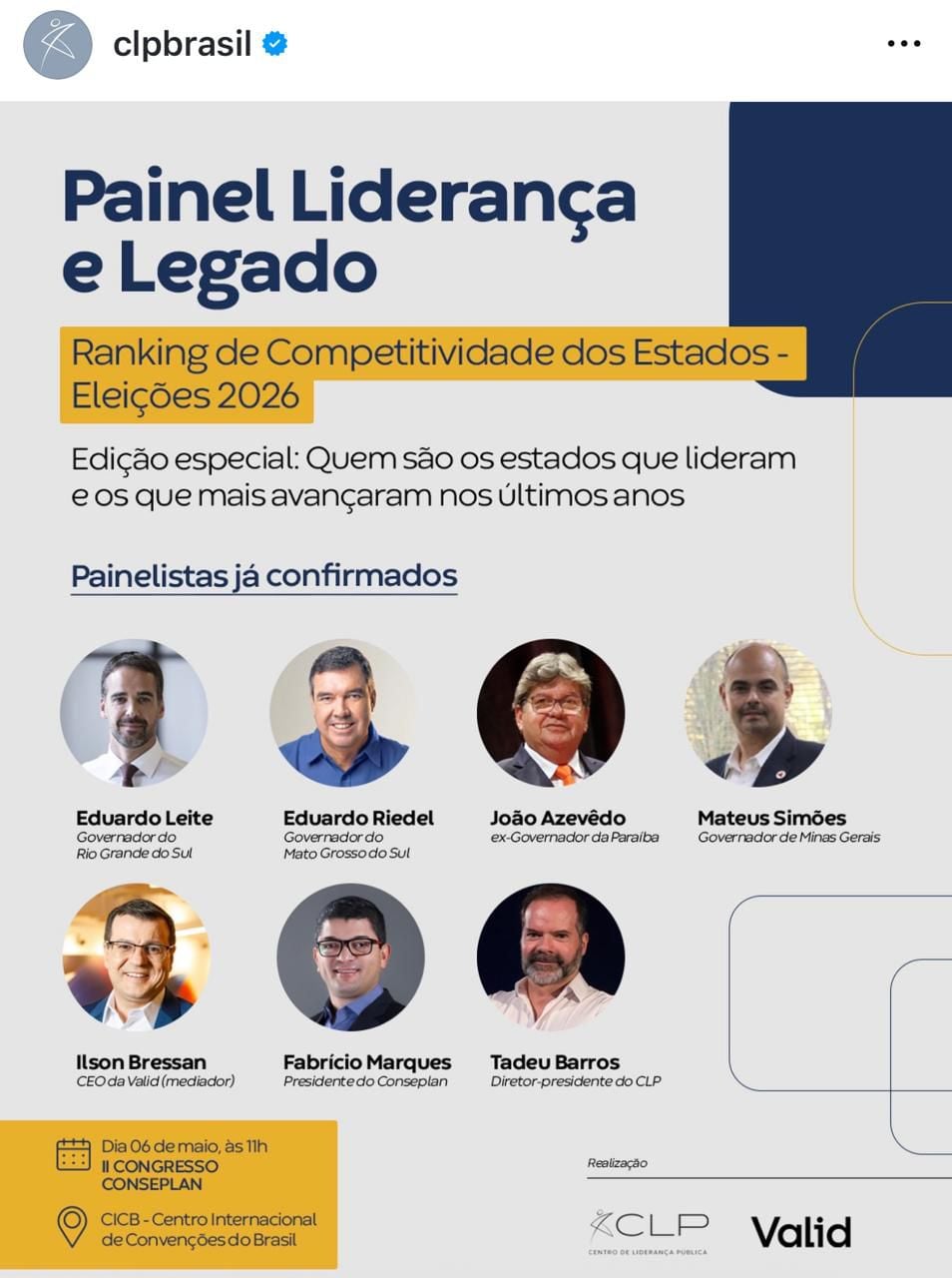O Centro de Liderança Pública (CLP), reúne no dia 6 de maio, em Brasilia, durante o ll Congresso do CONSEPLAN, algumas das principais lideranças estaduais do país para discutir o Ranking de Competitividade dos Estados – Eleições 2026. Entre os palestrantes está o ex-governador e pré-candidato a senador João Azevêdo (PSB) que falará sobre as diversas conquistas da Paraíba no seu governo, em diversas áreas como: crescimento do PIB, segurança, inovação, sustentabilidade ambiental, infraestrutura, mercado e competitividade.